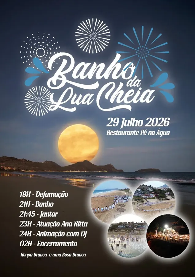 19:00 - Defumação, 21:00 - Banho, 21:45 - Jantar, 23:00 - Atuação Ana Ritta, 24:00 - Animação com DJ, 02:00 - Encerramento. Traje: Roupa Branca e uma Rosa Branca.