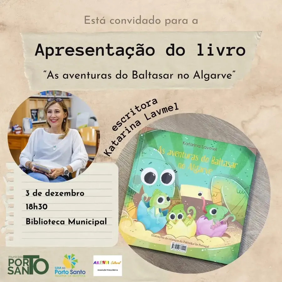 Apresentação do livro infantil "As aventuras do Baltasar no Algarve" pela escritora Katarina Lavmel. O evento é uma oportunidade para conhecer a obra e as ilustrações de crianças da Polónia e Portugal.