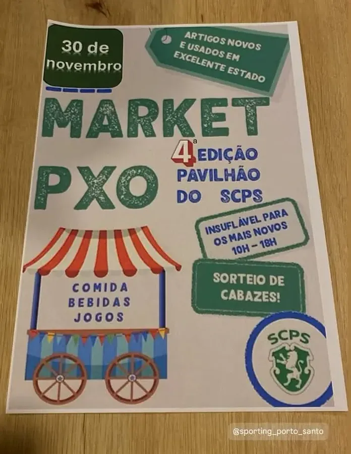 10:00 - Início do Market PXO. Venda de artigos novos e usados em excelente estado. Insuflável para os mais novos disponível das 10h às 18h. Comida, bebidas e jogos. Sorteio de cabazes. 18:00 - Encerramento do evento.
